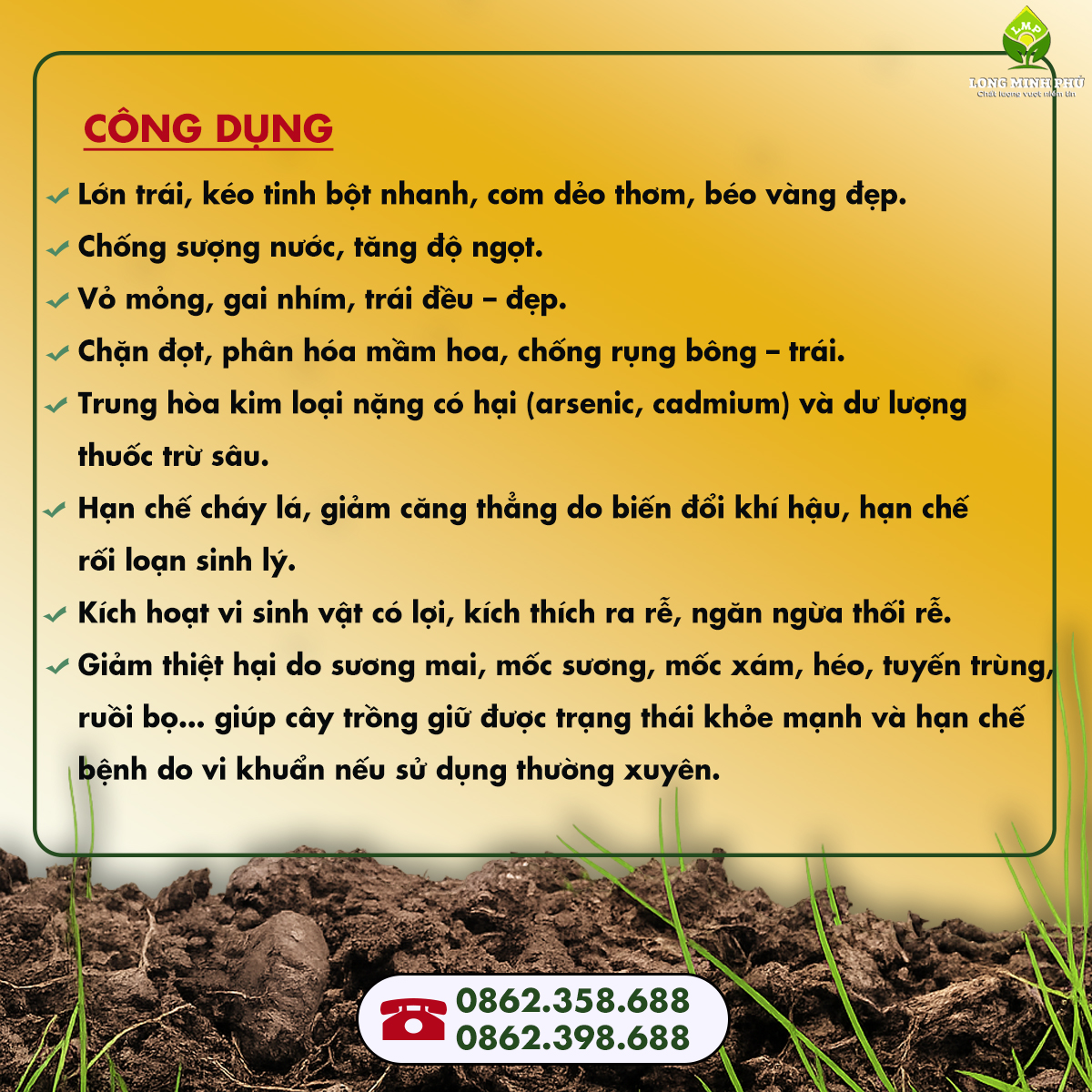 - Kích hoạt các vi sinh vật có lợi và tăng cường mô rễ, cải thiện sức đề kháng của đất, ngăn ngừa hiện tượng thối rễ và héo.