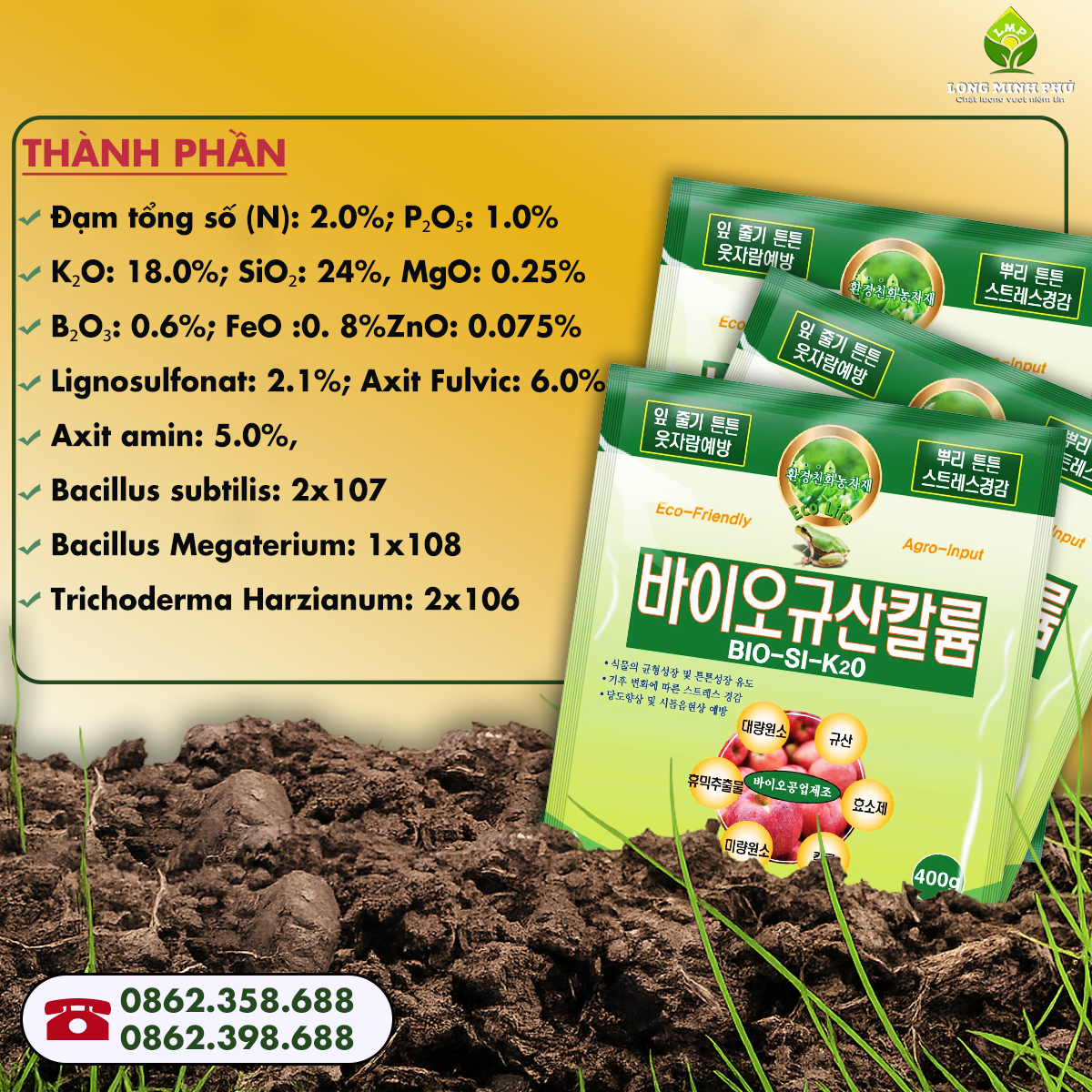 - Đạm tổng số (N): 2.0%, P2O5: 1.0%, K2O: 18.0%, SiO2: 24%,